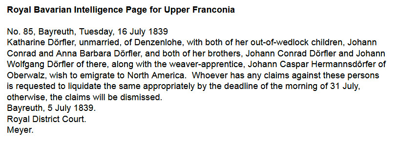 Another new source of information comes from the German Genealogy Group and their database of newspaper articles. Each entry in the German Emigration Database is an emigration notice printed in newspapers. "Printing the notice gave the newspaper readers plenty of time to put in a claim if they were owed money by the person leaving." Sure enough, Johann Wolfgang followed this procedure and his departure was duly announced in the Royal Bavarian Intelligence for Upper Franconia: